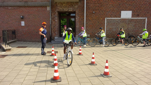 Ce jeudi 25 mai 2023, des agents de police sont venus encadrer nos élèves de 5ème et 6ème années pour une activité de sécurité routière. Après un rappel théorique, ils se sont rendus dans la cour de récréation aménagée en terrain didactique. Nos jeunes cyclistes ont parcouru plusieurs fois le circuit comprenant un slalom ... Ensuite, ils ont pris la route, escortés par les agents de police. Cette "sortie" leur a permis de prendre conscience des endroits stratégiques et des dangers du quartier avoisinant l'école. Pour clôturer l'activité, un diplôme leur a été remis. En cette période, « avant-veille » des vacances, il leur a été rappelé l'importance de rouler avec un vélo en ordre, le port du casque et surtout la prudence. Un grand merci aux agents de police !